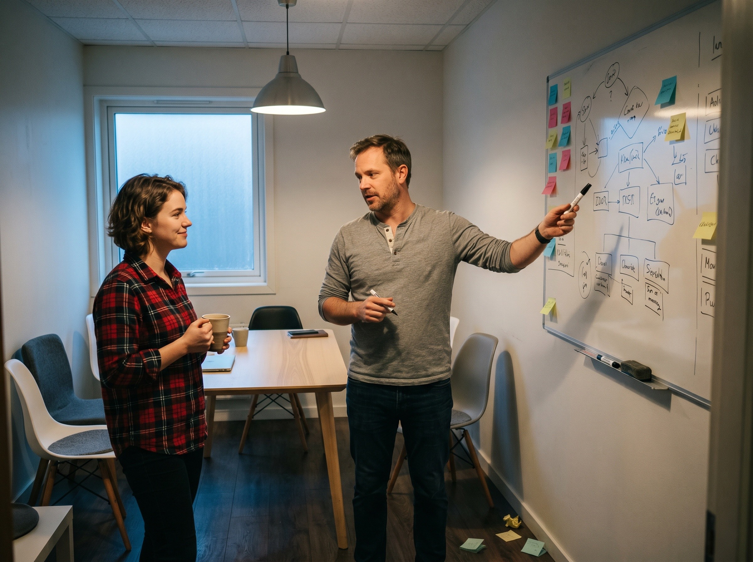 Kaksi työkaveria keskustelee ideoista valkotaulun äärellä pienessä neuvotteluhuoneessa