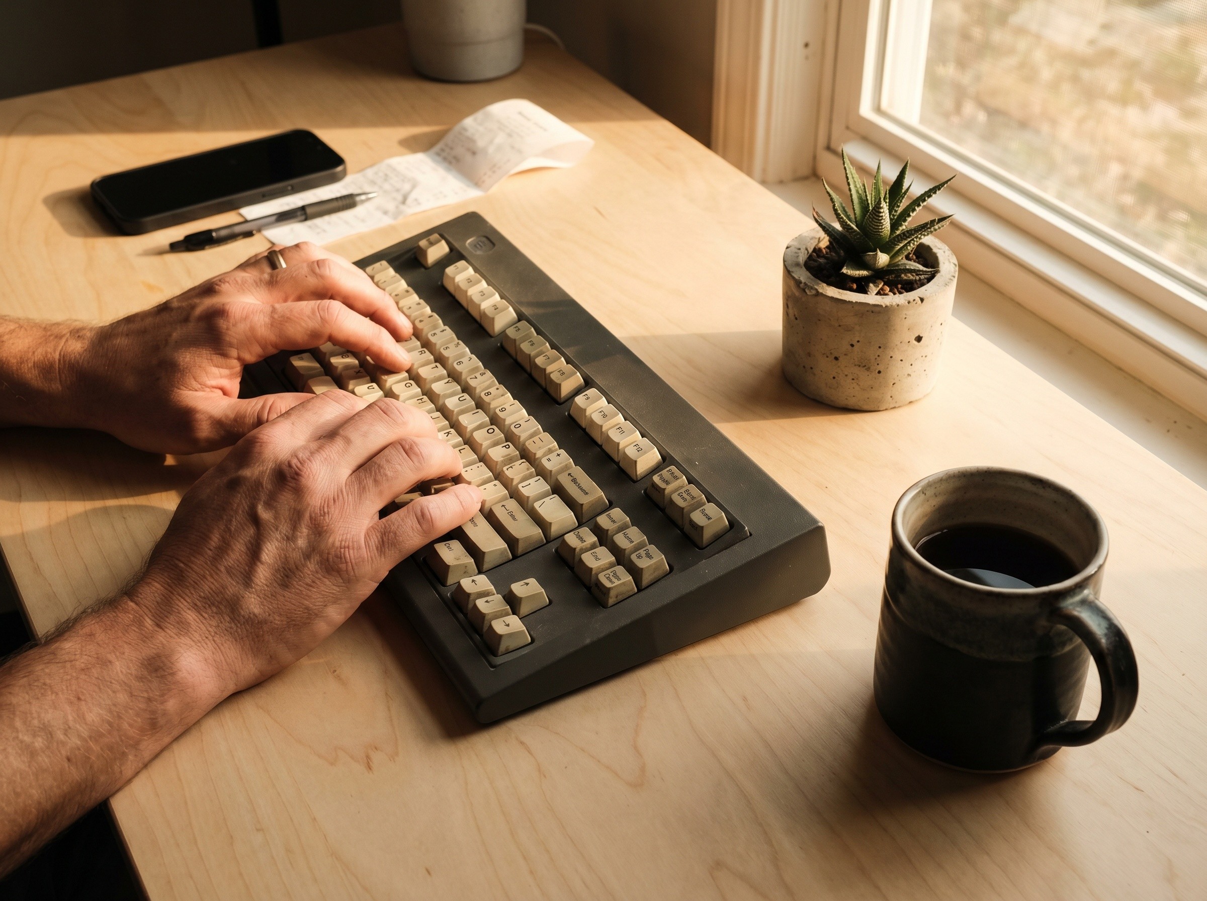 Lähikuva käsistä kirjoittamassa vanhalla näppäimistöllä koivuisella työpöydällä kahvikupin vieressä